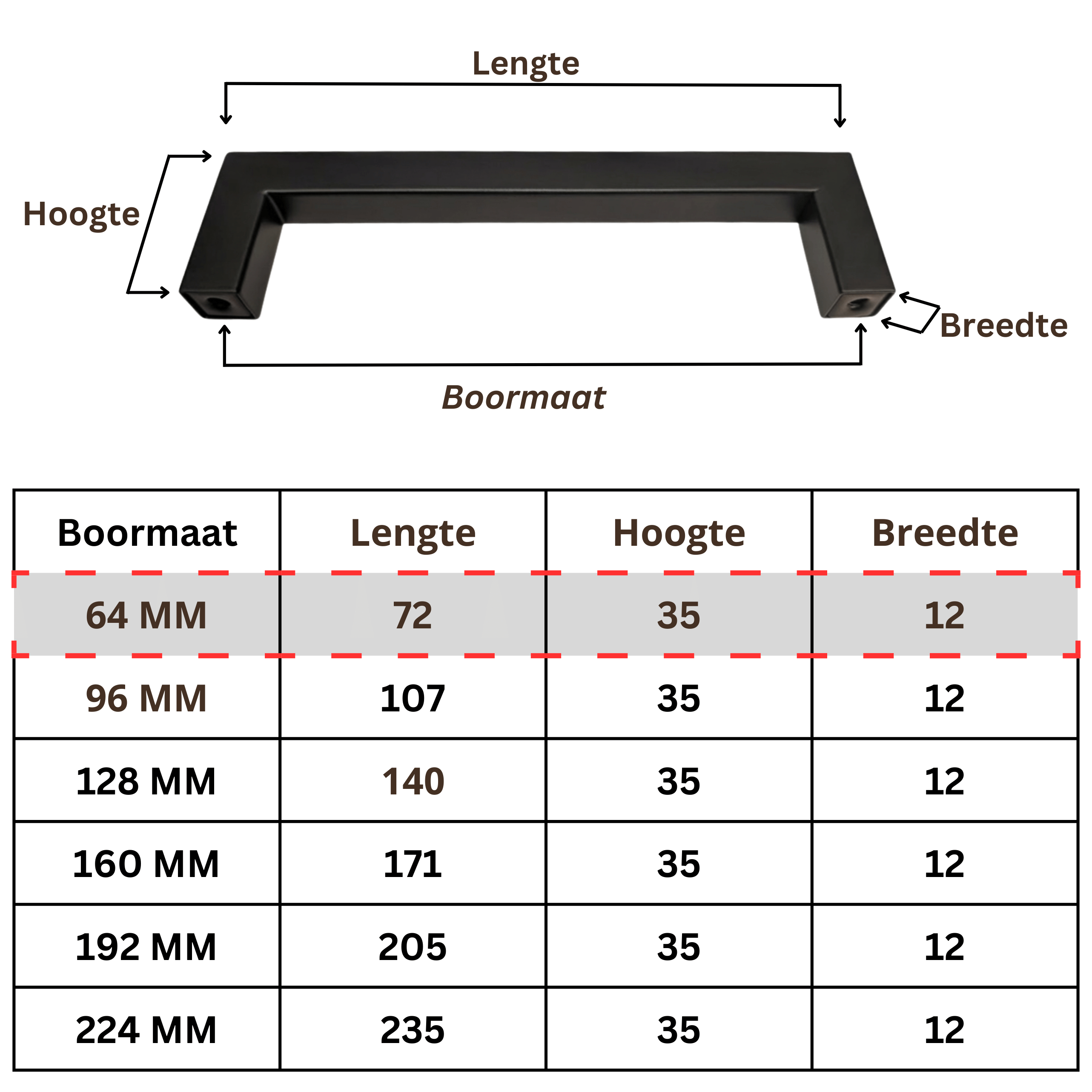 De boormaat is de afstand tussen de montagegaten. De totale lengte is de volledige buitenmaat van de greep. Voor bestaande gaten is de boormaat het belangrijkst.