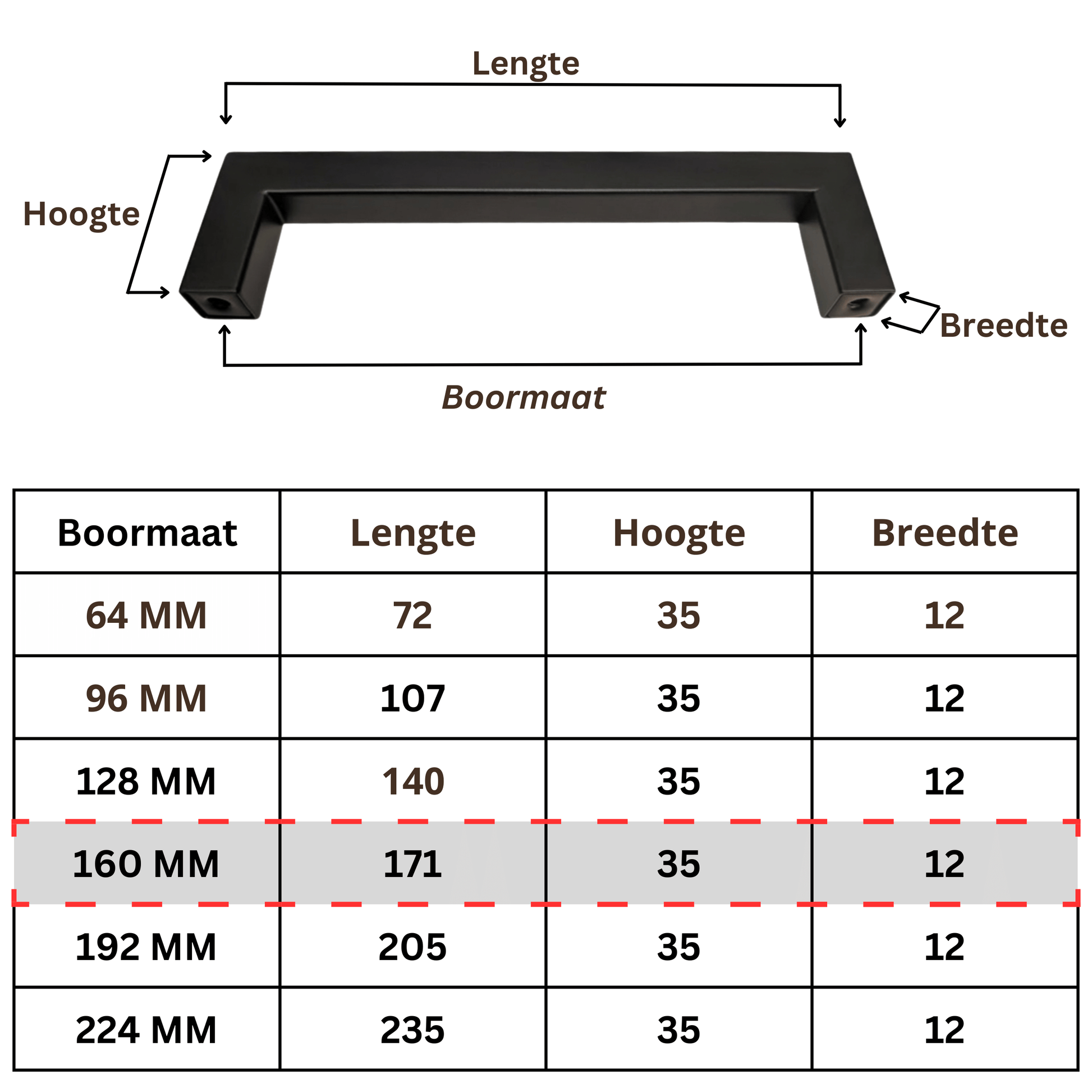 De boormaat is de afstand tussen de montagegaten. De totale lengte is de volledige buitenmaat van de greep. Voor bestaande gaten is de boormaat het belangrijkst.
