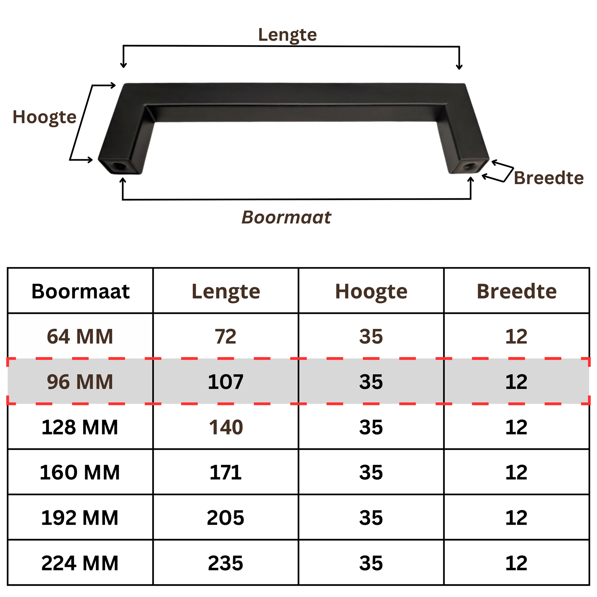 Veelvoorkomende boormaten zijn 96mm, 128mm, 160mm en 192mm. Controleer altijd uw huidige maat, zodat u zeker weet dat het past.